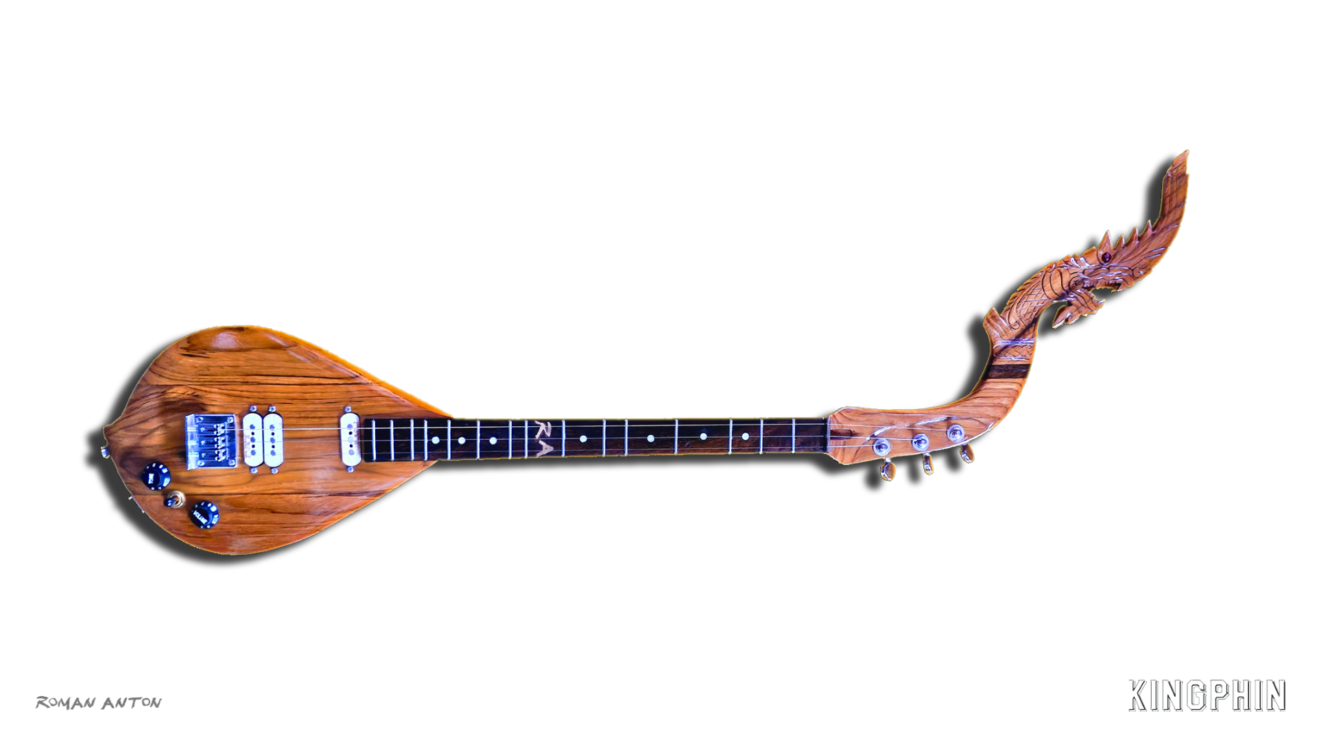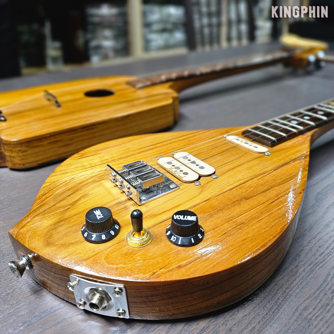 The “Soi Electric” limited edition second series phin guitar is handmade from teak wood exclusively from Northern Thailand. Like the Series 1, this model has a traditional 14 fret set with a custom-made brass “RA” inlay. Attach the removable naga (dragon) headstock, tune up and it’s ready to play. The low set spring loading saddle allows for adjustments, and the clean-cut nut allows for easy strumming and easier bending and picking. Series 2 has a new custom bridge and a new three magnet, combined double coil and a single coil pickup of which allow for multiple settings. The pick-up casing is Rosewood with inserted alnico magnets. The coil wire length is 40 centimeters and the spacing between strings is 10 millimeters. We use the same volume, tone and toggle as series 1, which nicely allow for a nearly endless series of sounds. The Soi Electric Series 2 comes with strings, a custom blended foldable carrying case, a black strap, a 6.5 foot (198 cm), quarter inch (6.35mm) ended cable, a hex key Allen wrench and one phin pick. For an additional cost, you can get the custom-made wooden case. The wood case has laser cut logos for KINGPHIN and Roman Anton on the outside, a soft faux fur inlay and protective padding on the inside, and an internal security holder for the naga headstock, wrench, strap, pick and more. You can also get the new heritage-plaid knit cloth case.